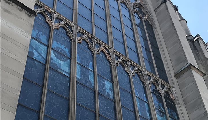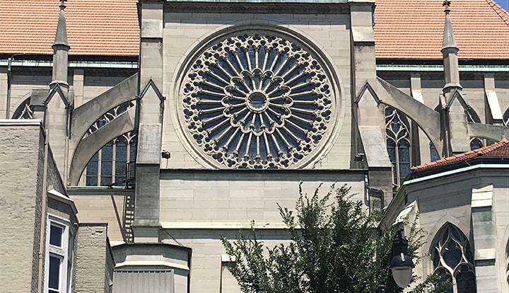 The Abbey Church of St Denis inspired the design of the cathedral in plan, and Notre Dame in Paris was the inspiration for the façade. Mayer Studios in Munich designed and produced the 82 stained glass windows, and local artists Frank Duveneck and Clement Barnhorn contributed murals and statues respectively to the building.